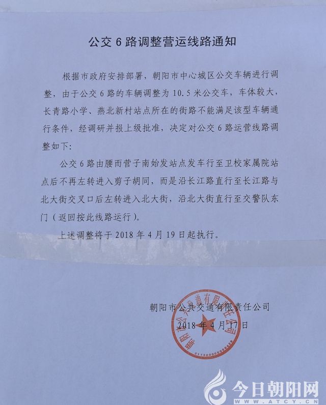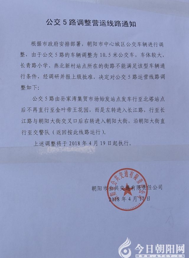 根據(jù)市政府安排部署,朝陽市中心城區(qū)公交車輛進行調(diào)整,由于公交5路、6路的車輛調(diào)整為10.5米,車體較大,長青路小學、燕北新村站點所在的街路不能滿足該型車輛通行條件,經(jīng)調(diào)研并報上級批準,決定對公交5路、6路運營線路調(diào)整如下: