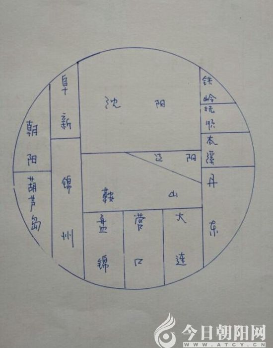 為了記住遼寧省的14個地級市,我用拓撲法繪制了一幅《遼寧是個雙黃蛋》:靠邊界的12個地級市按順時針方向依次是沈陽、鐵嶺、撫順、本溪、丹東、大連、營口、盤錦、錦州、葫蘆島、朝陽、阜新,不靠邊界且相鄰的是鞍山與遼陽。