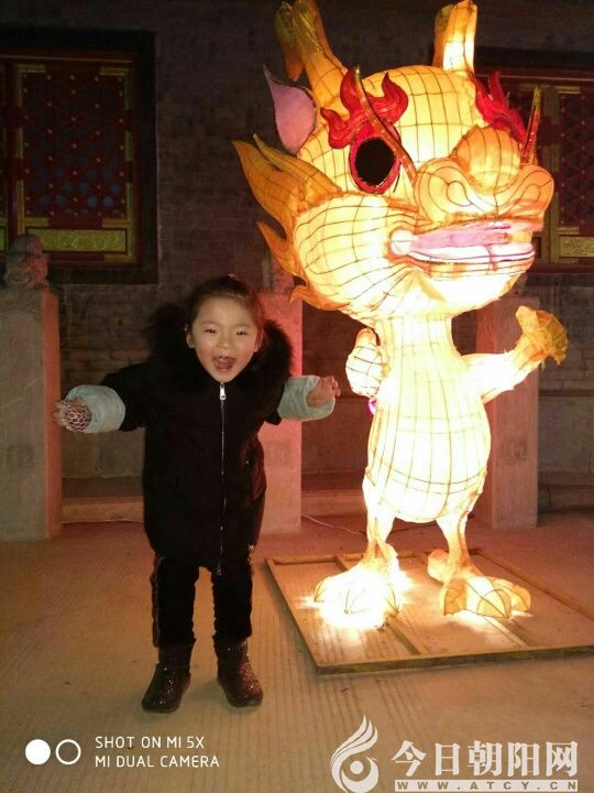 在觀賞彩燈時(shí),一個(gè)快樂小女孩學(xué)火龍彩燈的模樣,瞧!快樂小女孩與火龍彩燈同樂合影。