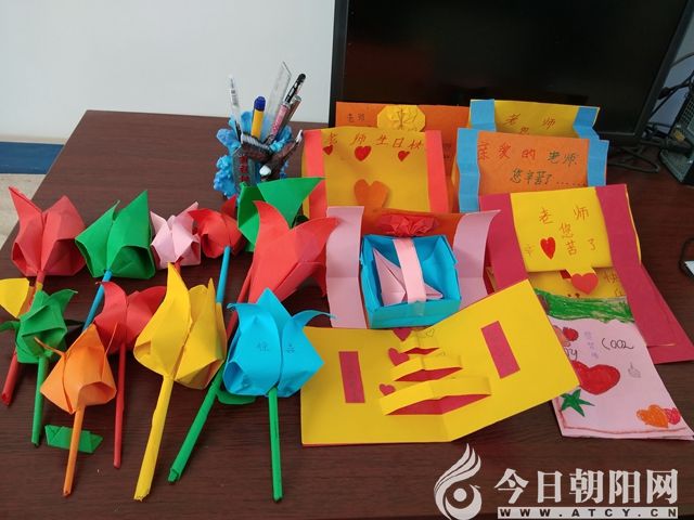在推開門的一剎那,我驚呆了,學(xué)生異口同聲對(duì)我說(shuō)生日快樂(lè),手里都拿著自己用彩紙做的手工。再看看黑板,布置精心,寫著滿滿的祝福,我不禁熱淚盈眶,激動(dòng)得無(wú)法言表。每個(gè)人的桌子上都擺著手工鮮花和賀卡,王宇鑫和馬明宇讓走讀生幫忙買了小蛋糕,王秋衡買了面包,劉華宇買了一袋餅干。我讓男女生分別站到講臺(tái)上,拿著自己的作品拍照,又把所有禮物擺在講桌上,變換著角度照相。我把吃的還給學(xué)生,手工作品全部收下,裝在一個(gè)大塑料袋里珍藏起來(lái)。這些不是簡(jiǎn)單的賀卡和小花,這是孩子們真情實(shí)感的表達(dá)。