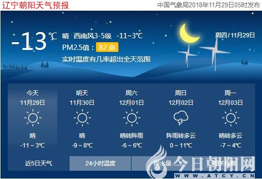 親愛的網友早上好!今天是11月29日,星期四,遼寧朝陽送走霧霾迎來了晴好天氣,氣溫-11~3℃,西南風3~5級。