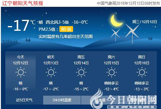 今天是2018年12月12日,星期三,農(nóng)歷十一月初六。遼寧朝陽晴,最低氣溫-16℃,最高溫度0℃,此時(shí)是西北風(fēng)3~5級,中午時(shí)將轉(zhuǎn)為3~5級的西南風(fēng),空氣質(zhì)量良好。日出時(shí)間:07:14;日落時(shí)間:16:28。
