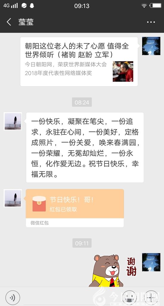 11月8日8時(shí)24分,手機(jī)忽然響了一下,查看微信,看見好友“瑩瑩”發(fā)來一個(gè)紅包,上面寫著“節(jié)日快樂!哥!”