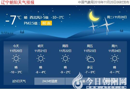 親愛的網(wǎng)友大家早上好!今天是11月20日,星期二,小編準(zhǔn)時來為您報天氣。本周遼寧朝陽多以晴天為主,但有多股弱冷空氣頻繁南下,受其影響,未來幾天氣溫將有小幅震蕩。今天,晴,最低溫度-10℃,最高溫度為3℃,同時伴有3~5級的西北風(fēng)。外出的網(wǎng)友建議著厚羽絨服、毛皮大衣加厚毛衣等隆冬服裝,年老體弱者尤其要注意保暖防凍,應(yīng)盡量減少外出。今日空氣質(zhì)量良好,可以正常參加戶外運動,但考慮天氣寒冷,風(fēng)力較強,推薦網(wǎng)友們進行室內(nèi)運動,若戶外運動請注意做好保暖措施。