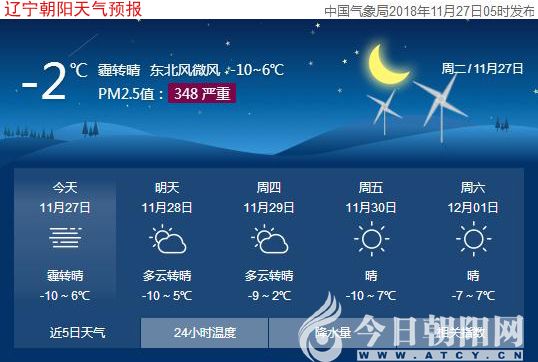 網友們早上好!近幾日,回暖的天氣是不是感覺很愜意呢?在這里小編要提醒大家,隨著風向的轉變,今兒個(11月27日),遼寧朝陽雖然天氣轉晴,但氣溫將有大幅下滑,最低氣溫為-10℃,最高溫度較昨天下降6℃,僅為6℃,東北風微風,風力不大。尤其需要注意的是,今天空氣質量非常不好,建議大家減少外出,留在室內,并關好門窗。此外,氣溫下降,極易發(fā)生感冒,請老人及兒童注意適當增減衣服,加強自我防護。