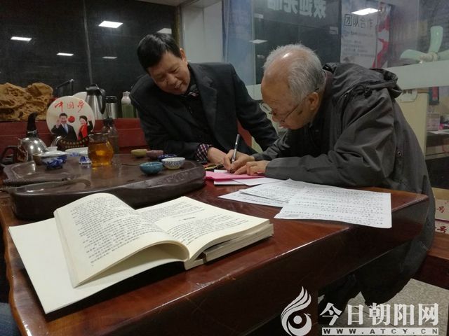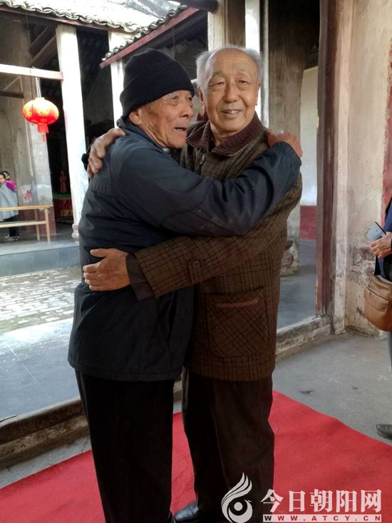 2018年1月上旬,在高州最古老的長坡鎮(zhèn)舊城冼太廟內(nèi),今年86歲的馮培元老人(左)與今年83歲的馮永謙(右)一見如顧(張松 攝)