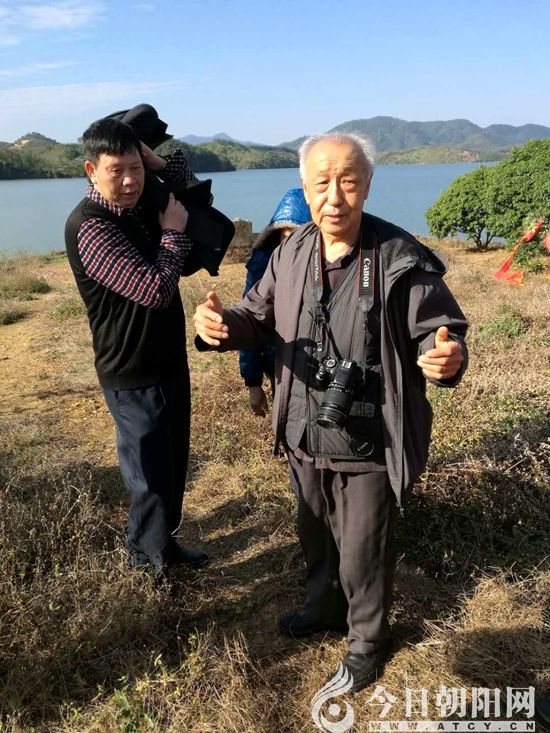 馮永謙先生(右)在高州聽高州電視臺名主持人李?。ㄗ螅┲v解高州文筆塔歷史。他曾于2015年底在北票馮素弗墓為李健講北燕歷史(張松 攝)