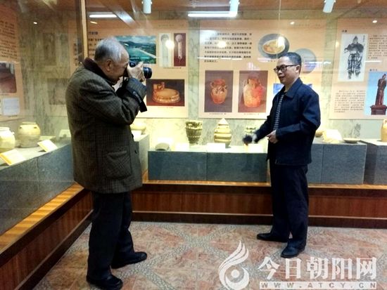 馮永謙先生(左)在高州博物館內(nèi)聽陳冬青館長(右)做館陳高州文物講解并拍攝(張松 攝)