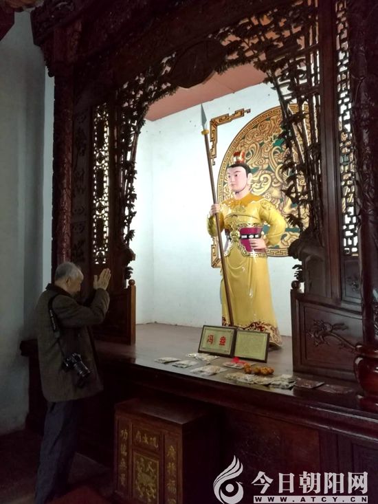馮永謙先生拜高州冼太廟內(nèi)的隋左武衛(wèi)大將軍馮盎像,他曾寫過馮盎隨隋煬帝征東的古戰(zhàn)場考證文章(張松 攝)