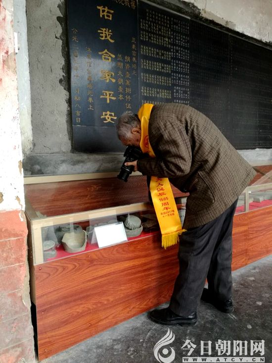 馮永謙先生在高州長坡舊城冼太廟內(nèi)拍攝出土文物(張松 攝)