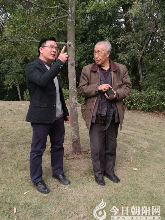 馮永謙先生(右)在高州長坡冼夫人中學(xué)校園內(nèi)的高州長坡中學(xué)與北票西官中學(xué)兩地友誼樹前,與高州長坡鎮(zhèn)冼夫人中學(xué)校長呂國環(huán)(左)合影留念(張松 攝)