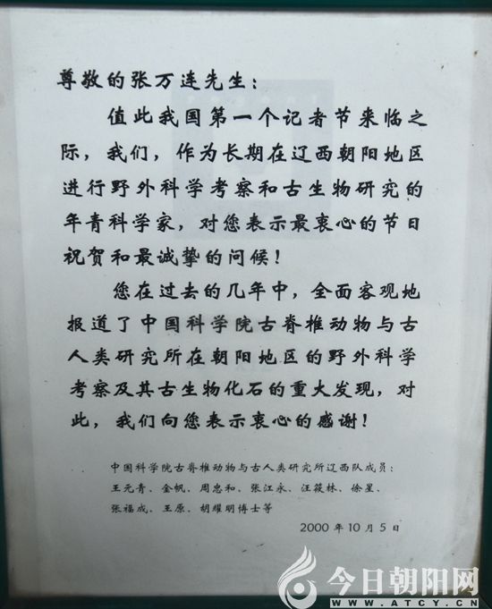 后來,張萬連老師又把目光轉向研究、報道朝陽古生物化石上來,從全景式的化石推介、普及科學知識,到打造化石文化、呼吁化石保護,取得了一個又一個令人矚目的新成績。2000年中國第一個記者節(jié)到來的時候,張萬連收到了中科院8位博士聯(lián)名寫給他的信,表達了對他的崇高敬意。消息傳出,立即引來了無數(shù)贊嘆、羨慕的目光。