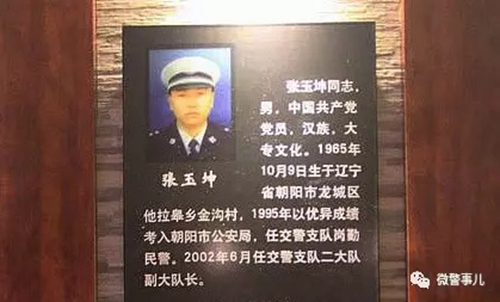 張玉坤,出生于朝陽(yáng)市龍城區(qū)他拉皋鄉(xiāng)金溝村。1995年11月,以優(yōu)異成績(jī)考入朝陽(yáng)市公安局交通警察支隊(duì)。先后任二大隊(duì)崗勤民警、中隊(duì)長(zhǎng)、副大隊(duì)長(zhǎng)。2003年4月27日11時(shí)25分,在執(zhí)行公務(wù)過程中與歹徒英勇搏斗,壯烈犧牲,年僅38歲。
