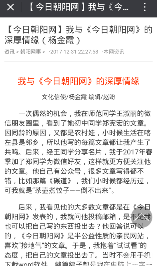 此后,我稍有靈感就寫出來(lái)投稿,一發(fā)不可收拾。有時(shí)候半夜孩子睡覺了,我起來(lái)“奮筆疾書”,很多編輯又成了我的好友。我漸漸開始在手機(jī)上寫,學(xué)會(huì)了語(yǔ)音錄入,還會(huì)在手機(jī)上用郵箱投稿,這樣省時(shí)省力。在2017年最后一天,有點(diǎn)強(qiáng)迫癥的我在大晚上趕寫了《我和今日朝陽(yáng)網(wǎng)的深厚情緣》,因?yàn)樾枰訄D片,又得在電腦上弄,所以很費(fèi)勁,我當(dāng)時(shí)聯(lián)系編輯,能否在零點(diǎn)鐘聲敲響之前幫我發(fā)表。我用郵箱錯(cuò)投了一篇空文檔,然后去陪倆孩子了,過了很長(zhǎng)時(shí)間,打開手機(jī)才看見編輯的留言,又投,終于如愿以償,在最后一天發(fā)表了第12篇文章。剛才數(shù)了數(shù),好像已有20多篇了,只要在《今日朝陽(yáng)網(wǎng)》首頁(yè)搜索欄輸入“楊金霞”,就能看見我所有的文章。每天看見網(wǎng)站其他文友的文章,我都會(huì)細(xì)細(xì)品讀,也會(huì)為他們點(diǎn)贊。