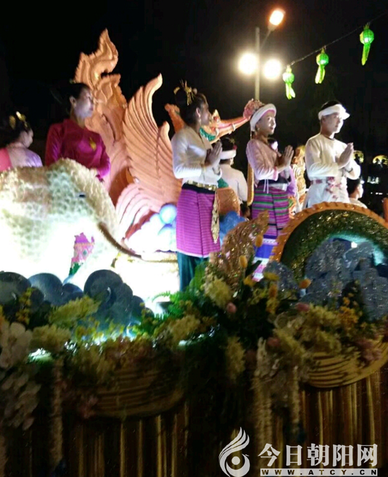 晚上8:00,中老緬泰四國盛裝花車巡游開始了,觀眾有秩序地等在萬象大道兩旁。8:10,花車巡游隊伍從告莊西雙景大門向大金塔廣場緩緩走來。走在最前面的是告莊西雙景“第二屆傣泐文化節(jié)”的金色大橫幅,緬甸老撾泰國和金塔傣家美食等花車舞蹈隊伍緊隨其后。大金塔二樓煙花同時騰空而起,星光璀璨、光彩奪目的煙花,驚艷了瀾滄江畔上空。