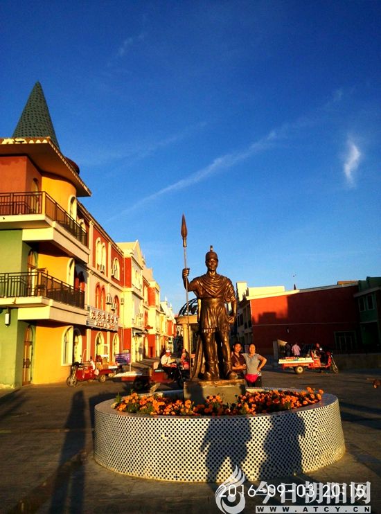 我們從魔鬼城來(lái)到布爾津時(shí),正是當(dāng)晚7點(diǎn)50分,內(nèi)地已是夜色四合,吃完晚餐8點(diǎn)30分許,這里依然天光大亮,夕陽(yáng)遲遲不愿意回家困覺(jué)。我們拍照時(shí),她依然興趣十足地湊熱鬧,打光,把我們的身影投射到飯店門(mén)前的古衛(wèi)士塑像花壇上,留在照片的影調(diào)里。在500多米的步行街散步,眼里全是俄羅斯情調(diào)、穆斯林意味的建筑,干凈整齊,謙和安靜。此時(shí),大概是上班族剛下班,與閑暇者忙于煮飯的緣故,小城沒(méi)有幾個(gè)散步的人,只有小販子騎了電動(dòng)三輪車(chē),追著向我們兜售新疆和田玉和水果。