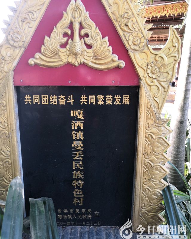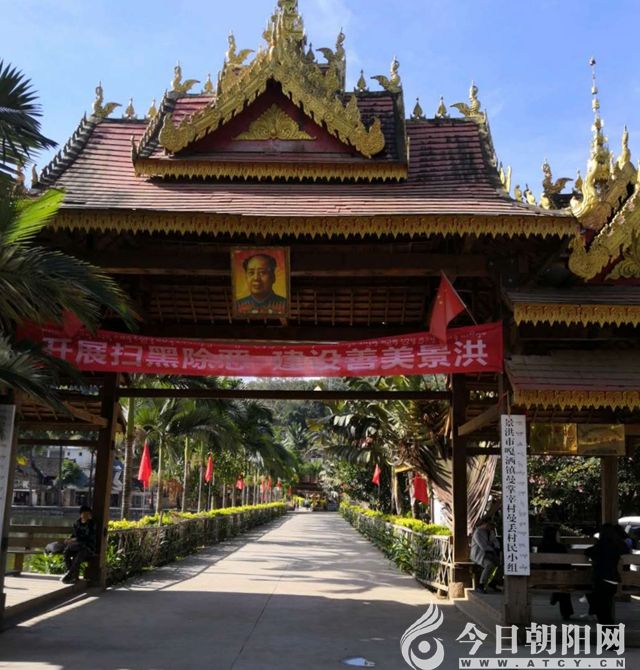 12月5日這天,馬大哥大嫂約我們?nèi)ヂ鼇G村看傣族原生態(tài)的千年古寨,我們起早準(zhǔn)備,欣然前往。上午9點(diǎn)多在嘎灑鎮(zhèn)下了一路公交,有很多蹦蹦車(chē)等候在站點(diǎn),馬大哥上前講價(jià),兩個(gè)人10元,三個(gè)人以上15元,我們雇了兩臺(tái)蹦蹦車(chē)前往曼丟村。好長(zhǎng)一段都在修路,蹦蹦車(chē)顛簸前行,9點(diǎn)半我們順利到達(dá),馬大哥他們的車(chē)走錯(cuò)路,晚到一會(huì)。一下車(chē)就驚喜連連,在這個(gè)千年古寨傣族風(fēng)格濃郁的牌樓顯著位置,竟懸掛著毛主席畫(huà)像。牌樓左手邊是一個(gè)好大的魚(yú)塘,七八寸長(zhǎng)的羅非魚(yú)不懼岸邊喧鬧的游人,暢游在清澈的池塘中。右手邊十多臺(tái)組團(tuán)旅游的大巴車(chē)和中客整齊地停在廣場(chǎng)上,后面還有幾輛旅游車(chē)陸續(xù)緩緩開(kāi)進(jìn)。