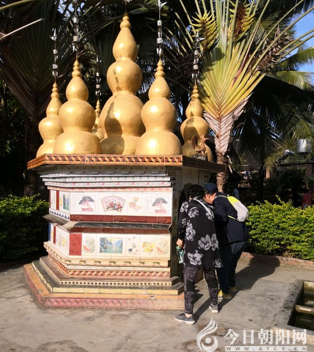 我們順著花團(tuán)錦簇飄著紅旗的通道往村里走,剛進(jìn)牌樓就看見(jiàn)一個(gè)奇特小巧的建筑,旁邊連接兩個(gè)清水池,馬大哥說(shuō)這是傣族村寨的水井。傣家人是個(gè)水文化濃郁的民族,他們認(rèn)為水是生命的源頭,是圣潔美好的象征,是大地之神。他們對(duì)水的敬畏、愛(ài)護(hù)、開(kāi)發(fā)與使用,世人無(wú)可比擬。曼丟村的這座水井已有一千多年的歷史,水井防護(hù)頂平臺(tái),中間建有一個(gè)主塔,周?chē)負(fù)碇∷總€(gè)塔頂立著一根鐵針,上面掛著風(fēng)鈴和金屬三角旗。井座繪有精美的浮雕,井內(nèi)鑲一面鏡子,利用反光觀察井水的清潔程度。一座水井的建設(shè),反應(yīng)出傣族人民的聰慧美好和對(duì)生活的熱愛(ài)。傣家水井建成之日,要為水井開(kāi)光,請(qǐng)和尚誦經(jīng)祝福,村民盛裝載歌載舞慶祝,以后每年的這天都要祭祀神明淘洗水井。