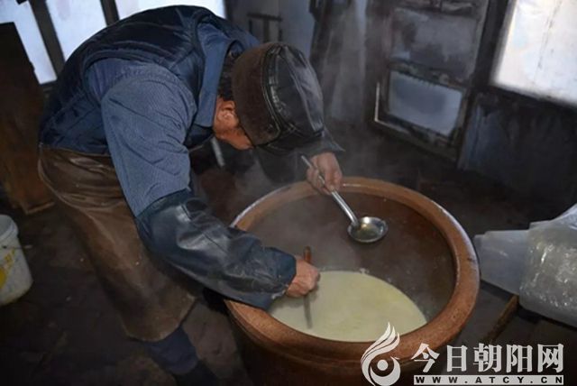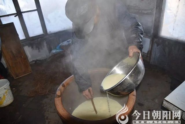 豆?jié){磨好,用開水沏一下,過籮。就是在大鍋上放兩條扁擔(dān),扁擔(dān)上放一個(gè)箅簾子,箅簾子上兩人扯著一條比紗布要細(xì)得多的紡織品(豆腐包),將沏好的豆?jié){倒入,倆人盡全力擠壓,待豆腐包內(nèi)漿全部被擠出之后,俗稱的過籮就結(jié)束了。過籮后,籮上是豆腐渣,是做肉丸子等的重要原料,有的農(nóng)戶還將它當(dāng)成做大醬的補(bǔ)充原料。籮下的漿進(jìn)入鍋里,煮沸,豆?jié){燒開后,淘進(jìn)缸里,然后用勺子慢慢攪和。此時(shí),可以拿個(gè)碗,喝碗熱熱的豆?jié){了。