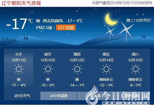 今天是2018年12月11日,星期二,農(nóng)歷十一月初五,遼寧朝陽晴,氣溫-17~-4℃,此時是東北風微風,中午轉(zhuǎn)為3~5級北風,空氣質(zhì)量一般,敏感人員外出時,要做好防護措施。日出時間:07:13;日落時間:16:28。