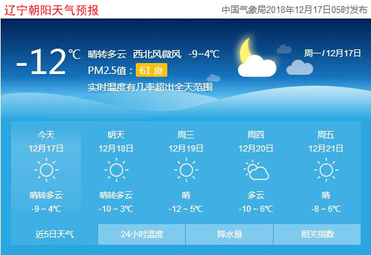 今天是2018年12月17日,農(nóng)歷十一月十一。遼寧朝陽(yáng)晴,氣溫-9~4℃,西北風(fēng)3~5級(jí),空氣質(zhì)量良好。日出時(shí)間:07:18;日落時(shí)間:16:29。