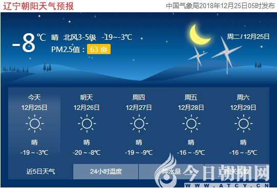 今天是2018年12月25日,星期二,農歷十一月十九,遼寧朝陽晴,氣溫-19~-3℃,北風3~5級,空氣質量良好。日出時間:07:23;日落時間:16:33。