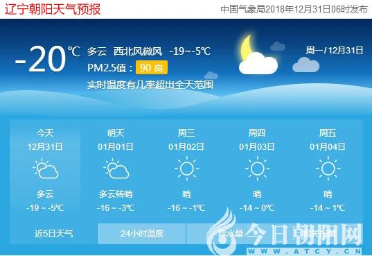 今天是2018年12月31日,星期一,農(nóng)歷十一月二十五,遼寧朝陽多云,氣溫-19~-5℃,西北風(fēng)微風(fēng),空氣質(zhì)量良好。日出時間:07:25;日落時間:16:37。