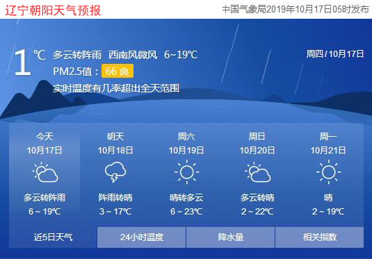 今天是2019年10月17日,星期四,農(nóng)歷九月十九。遼寧朝陽多云轉(zhuǎn)陣雨,氣溫6~19℃,南風(fēng)微風(fēng),空氣質(zhì)量良好。日出時間:06:10;日落時間:17:16。(中國氣象局2019年10月17日05時發(fā)布。)請隨時關(guān)注天氣變化。
