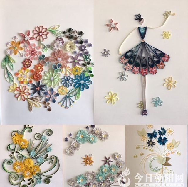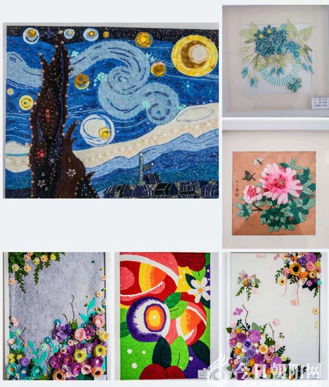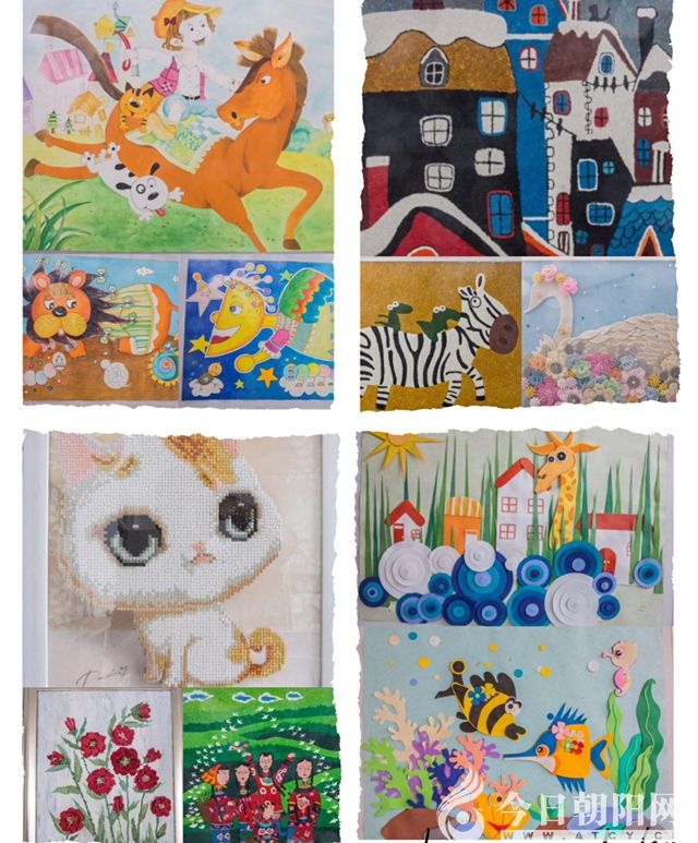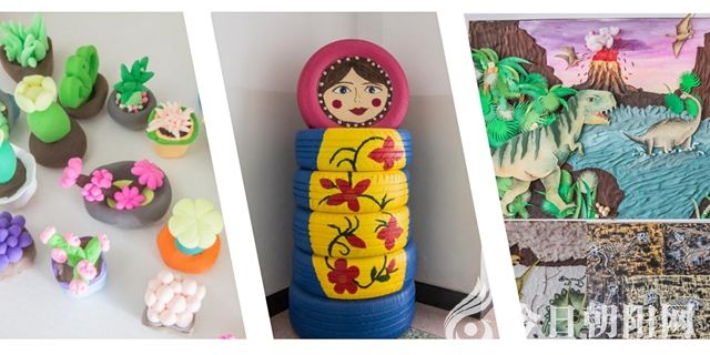 圖為學(xué)生們自己動(dòng)手做的作品,有簡(jiǎn)筆畫、剪紙、超級(jí)黏土、衍紙、紙漿畫、毛線畫、廢舊輪胎、刺繡等。