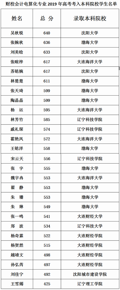 2019年高考,會計電算化專業(yè)升學(xué)考試再獲佳績、再創(chuàng)新高。該專業(yè)48名同學(xué)參加高考,有27名同學(xué)被遼寧省二本以上院校錄取。其中,吳秋銳和劉美晗同學(xué)分別以640分和633分考上了沈陽大學(xué),張婉秋同學(xué)以636分考上了渤海大學(xué),張暄梓以617分考上了大連海洋大學(xué)。