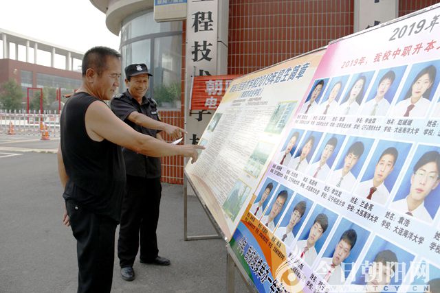 一位身著朝陽安平集團保安隊服的保安員站在人群中,指著“朝陽工校2019年中職升本的學(xué)生金榜”展板上的學(xué)生照片,不無自豪地解說:“這個孩子名叫黨鯤昊,今年他考出了全校第一的好成績,被遼寧工程技術(shù)大學(xué)錄取了;這個小姑娘是18級建筑升學(xué)班的栗爽,她特別有心,考入了大連海洋大學(xué);這個孩子叫高綺龍,考入了沈陽農(nóng)業(yè)大學(xué);陳凱去了遼寧石油化工大學(xué)……看看,這75個孩子都出息嘍!”