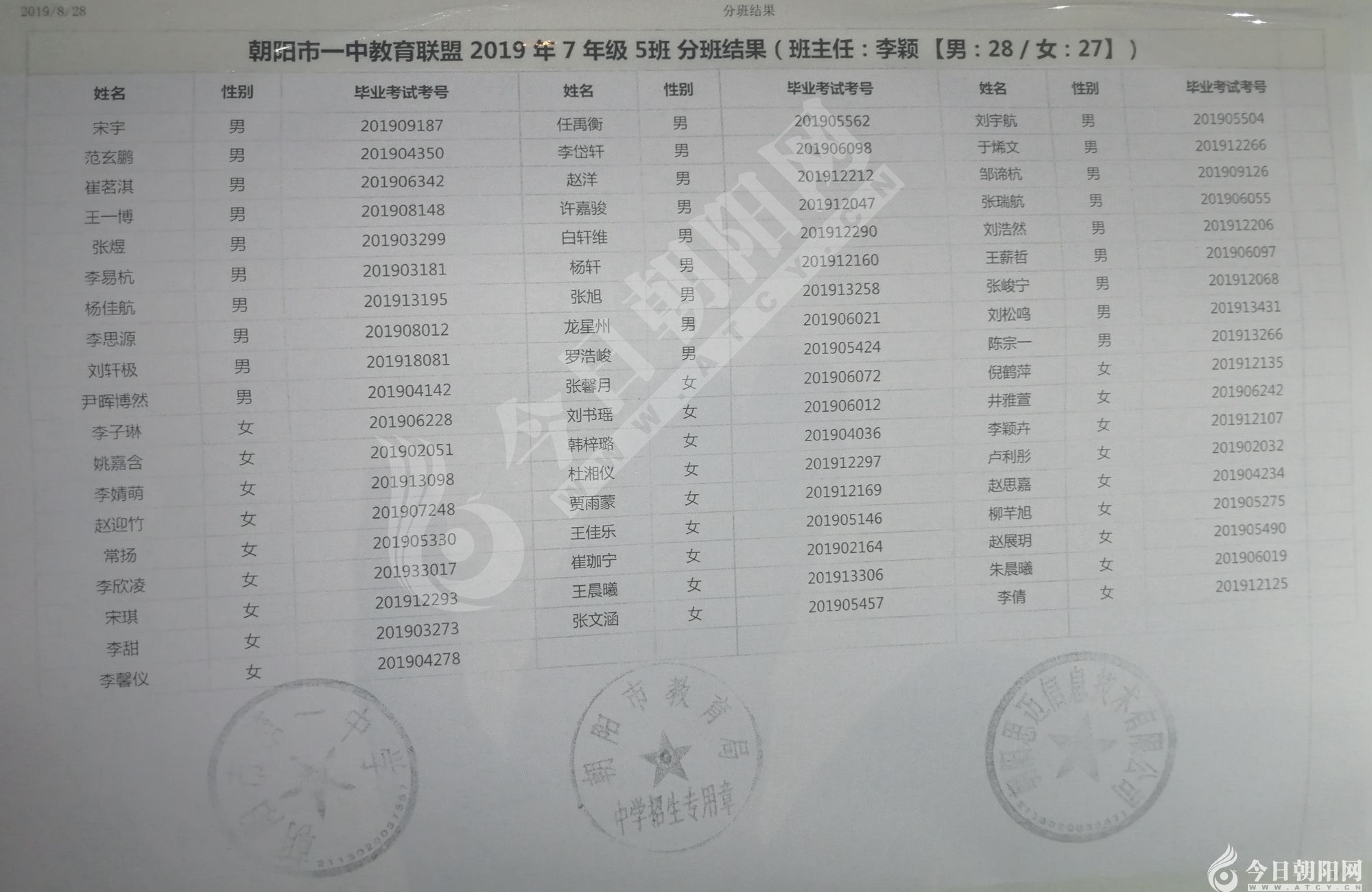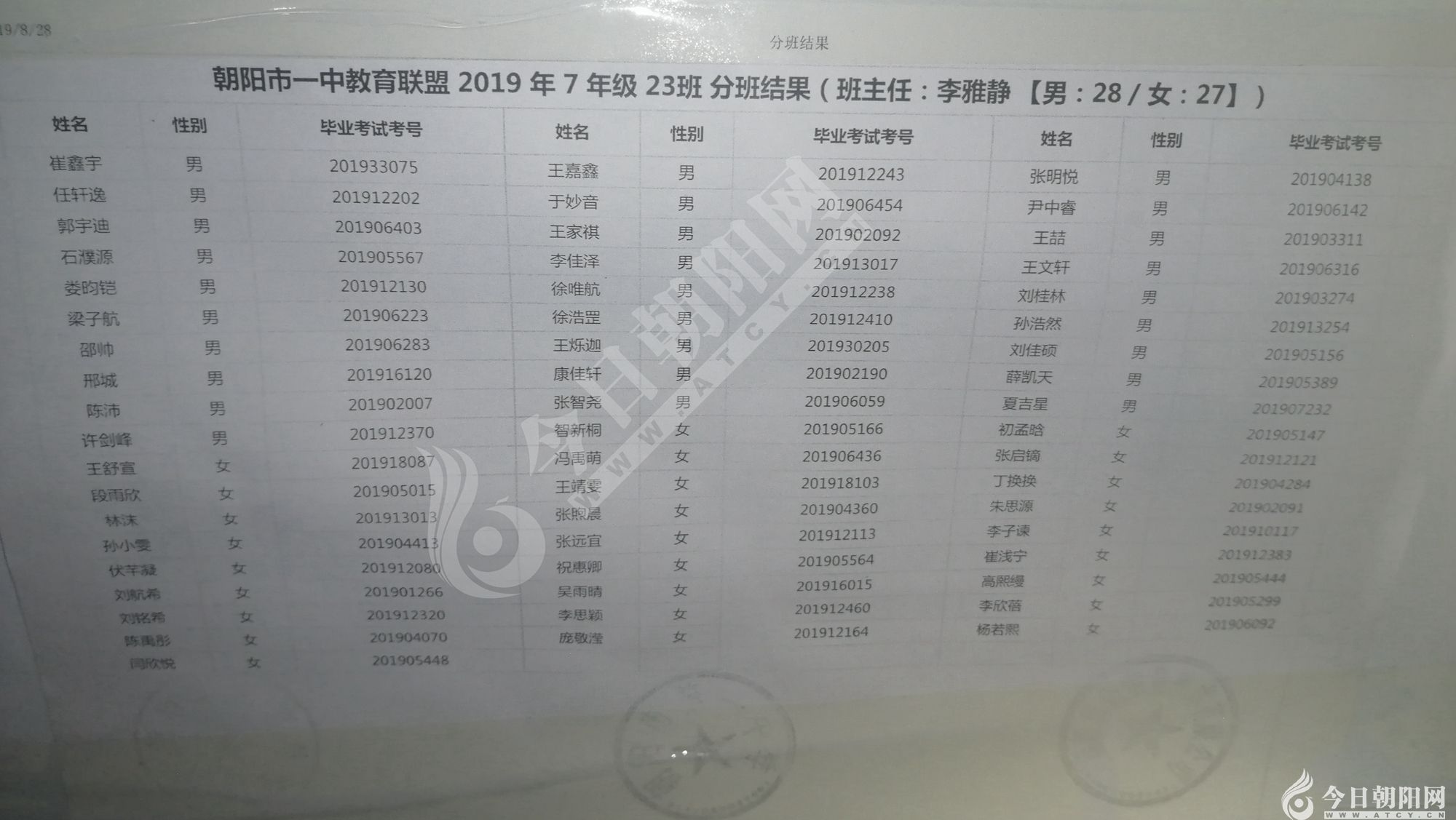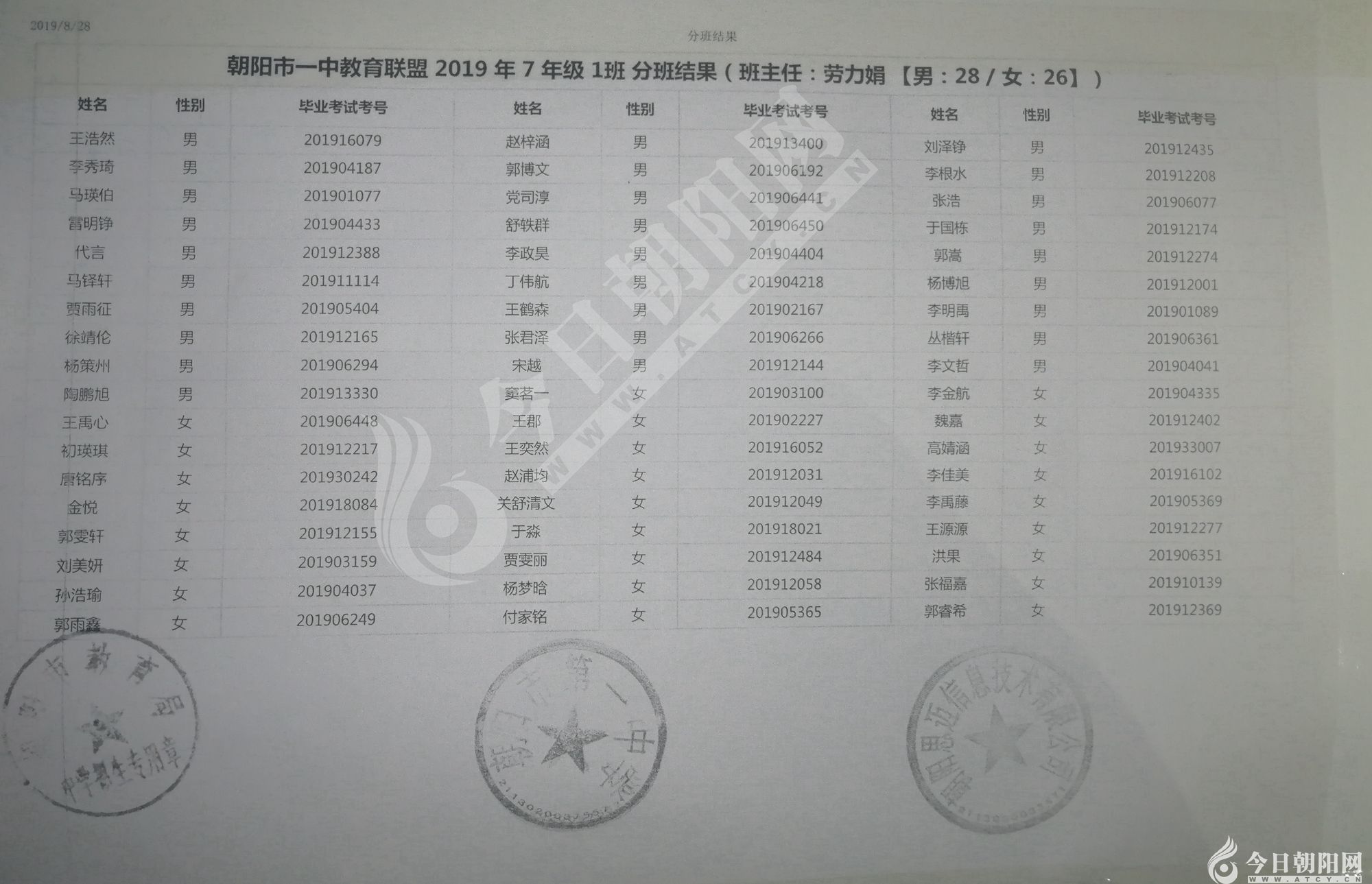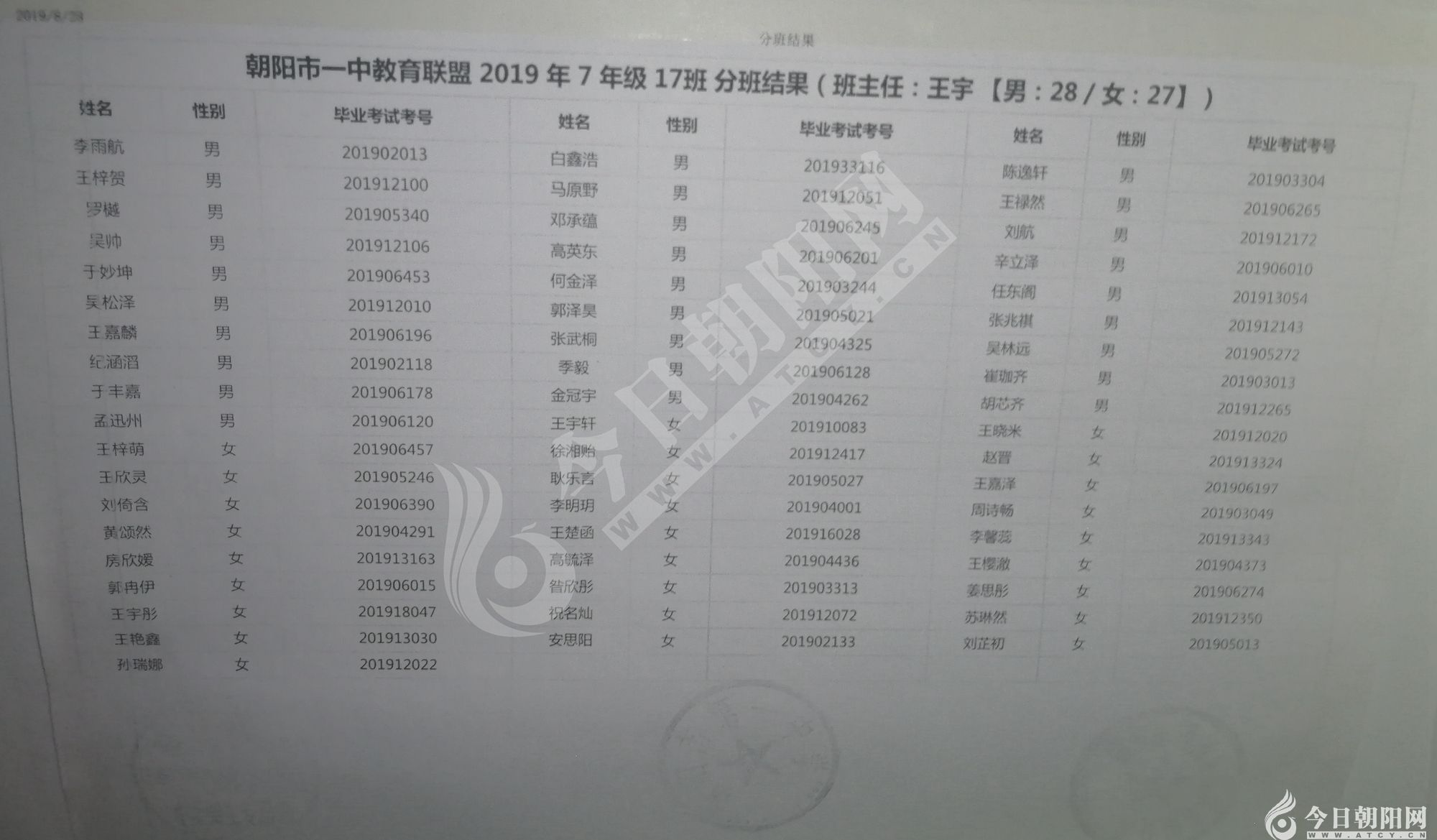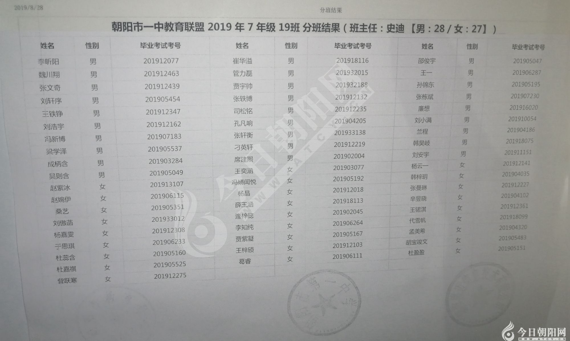 家長速看!朝陽市一中教育聯(lián)盟2019年新生分班表