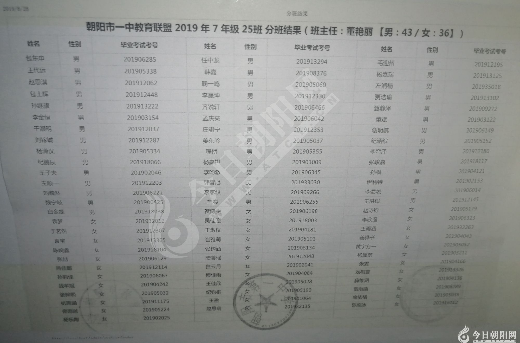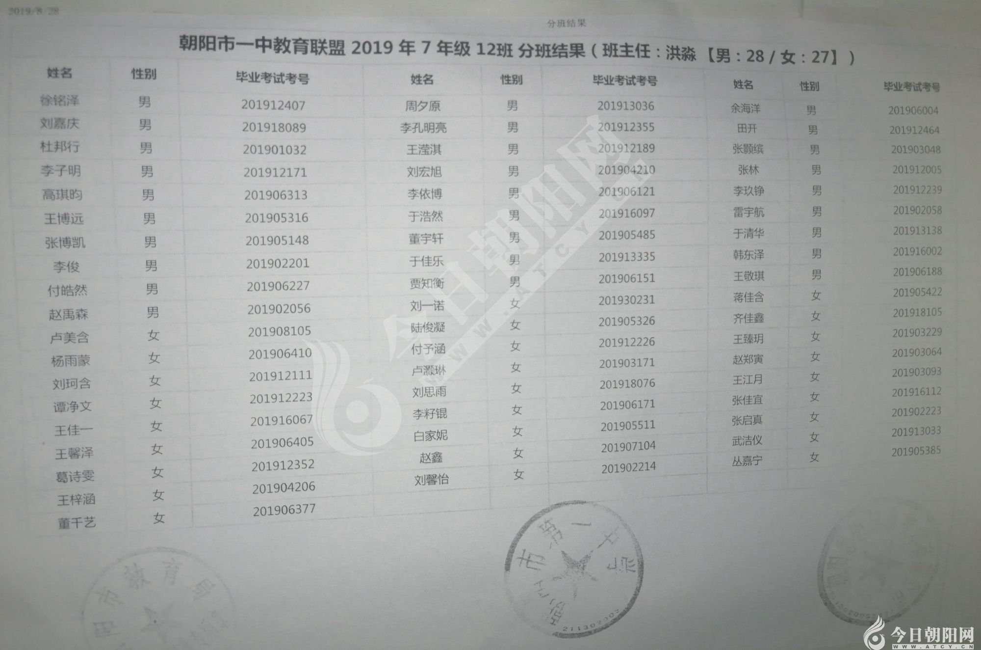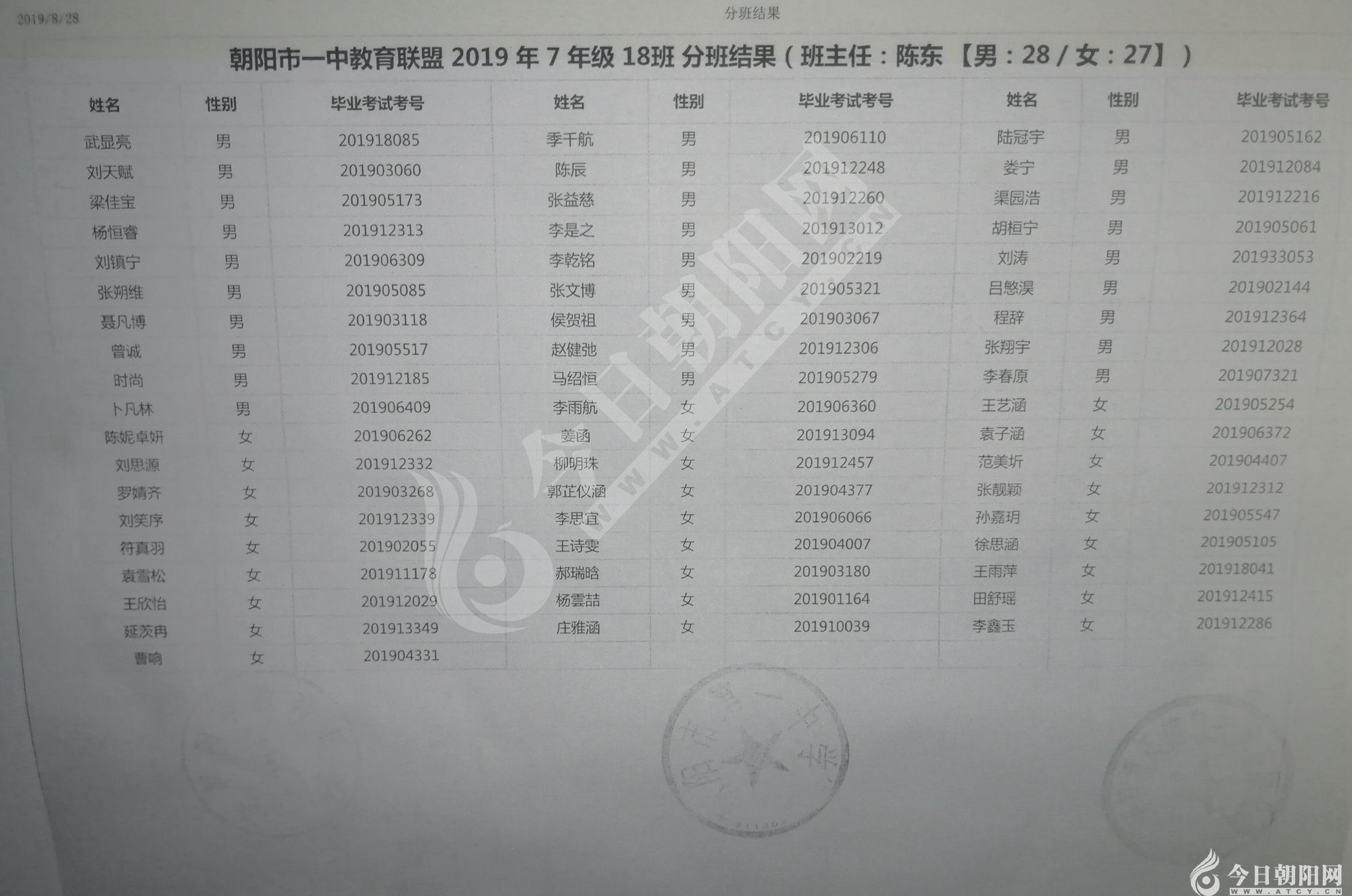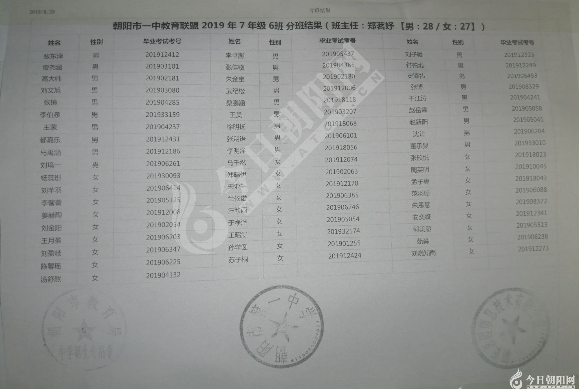 家長速看!朝陽市一中教育聯(lián)盟2019年新生分班表