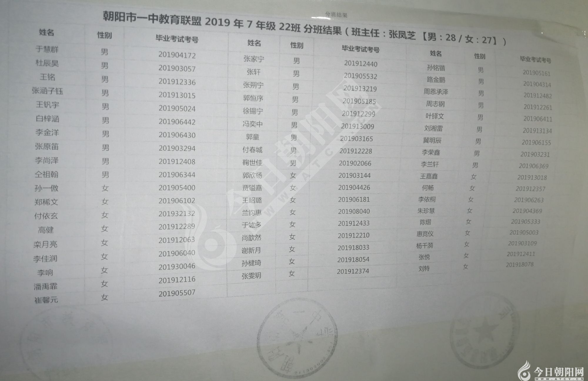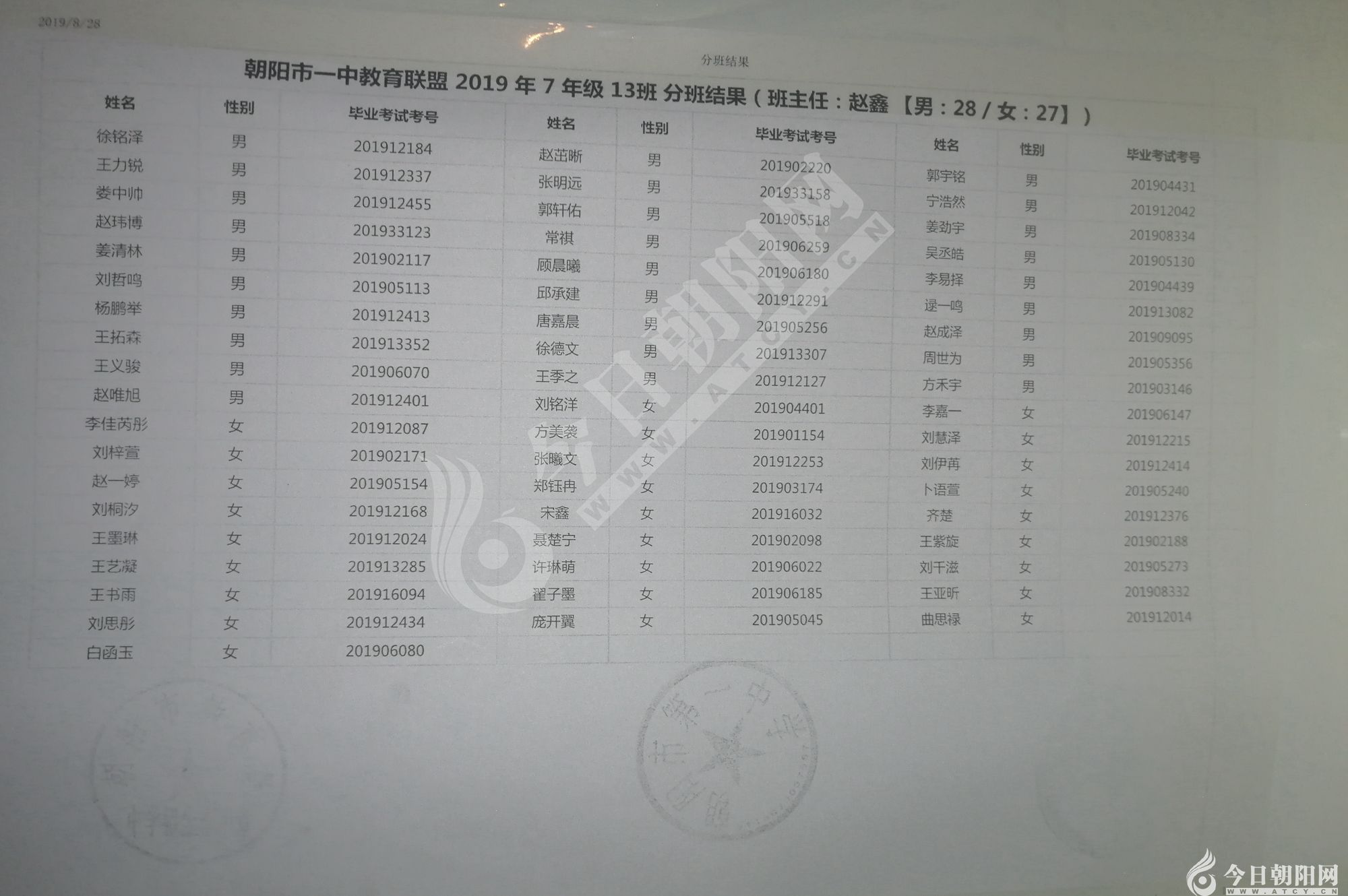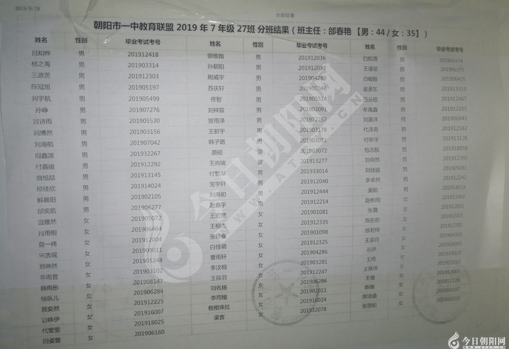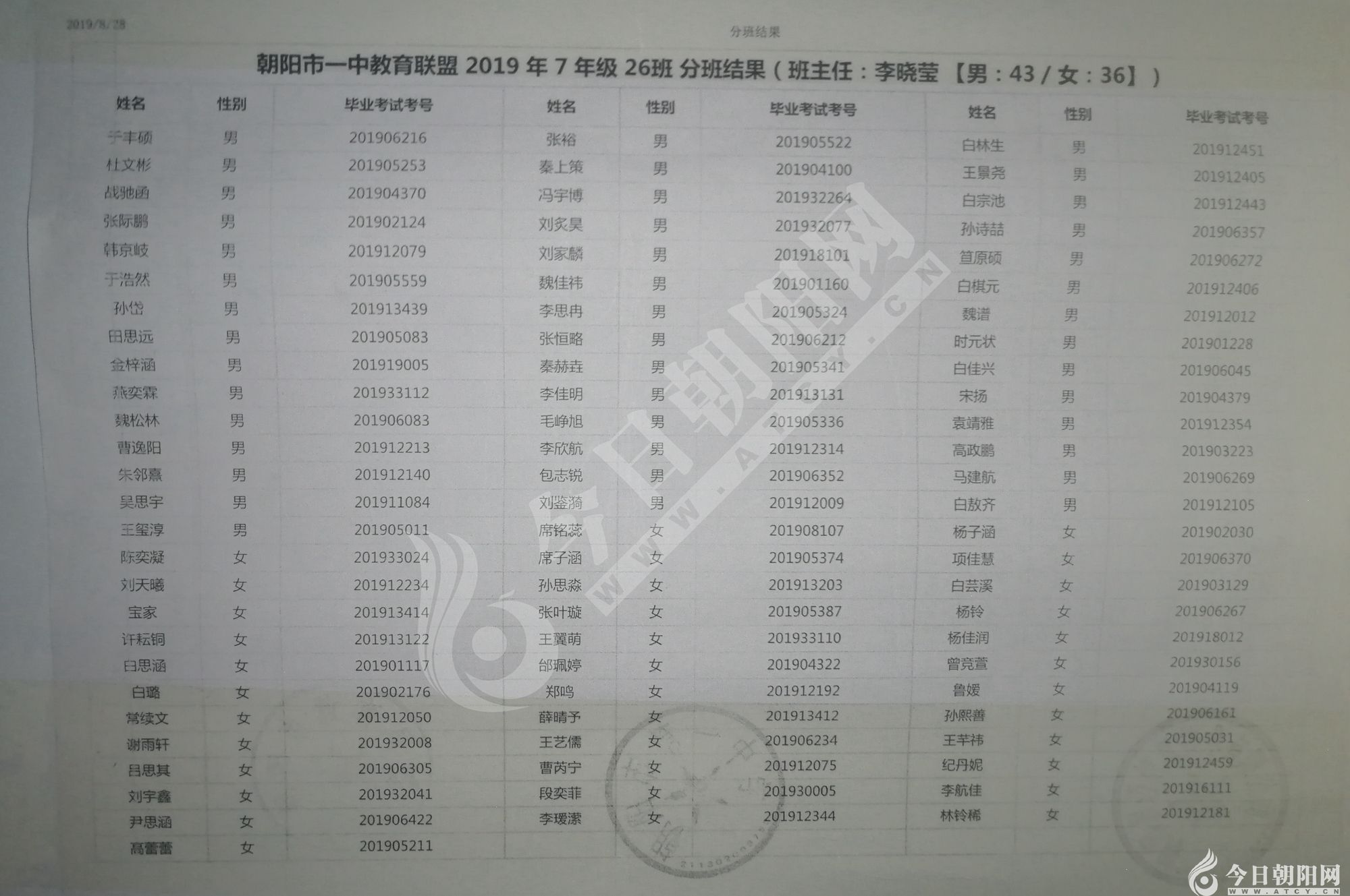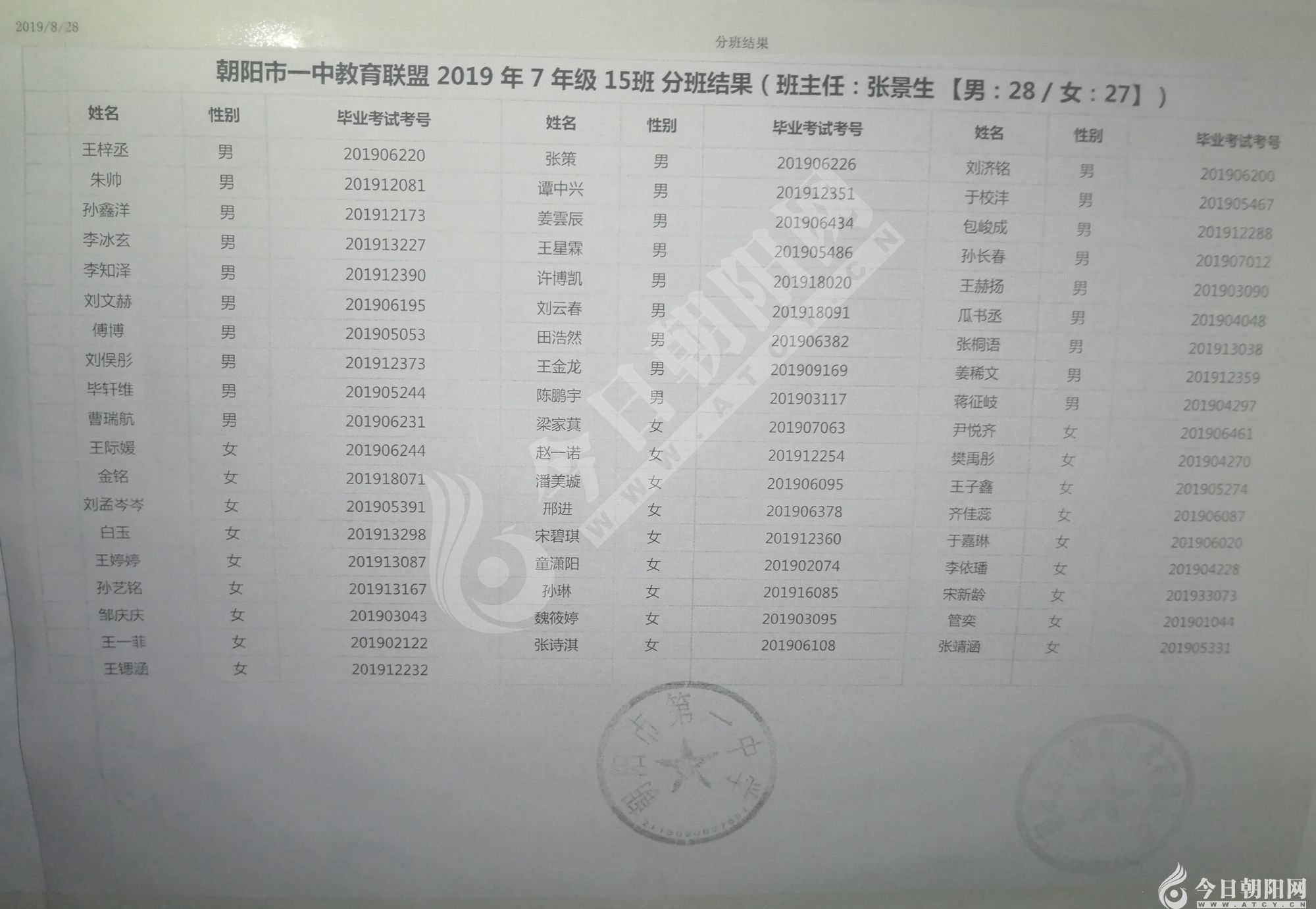 家長速看!朝陽市一中教育聯(lián)盟2019年新生分班表