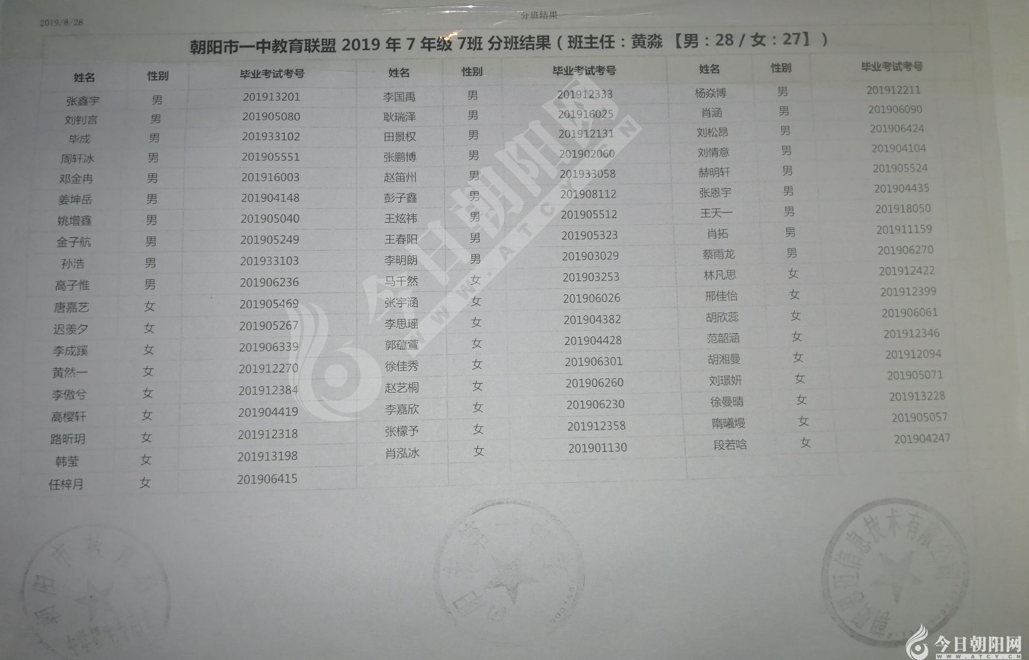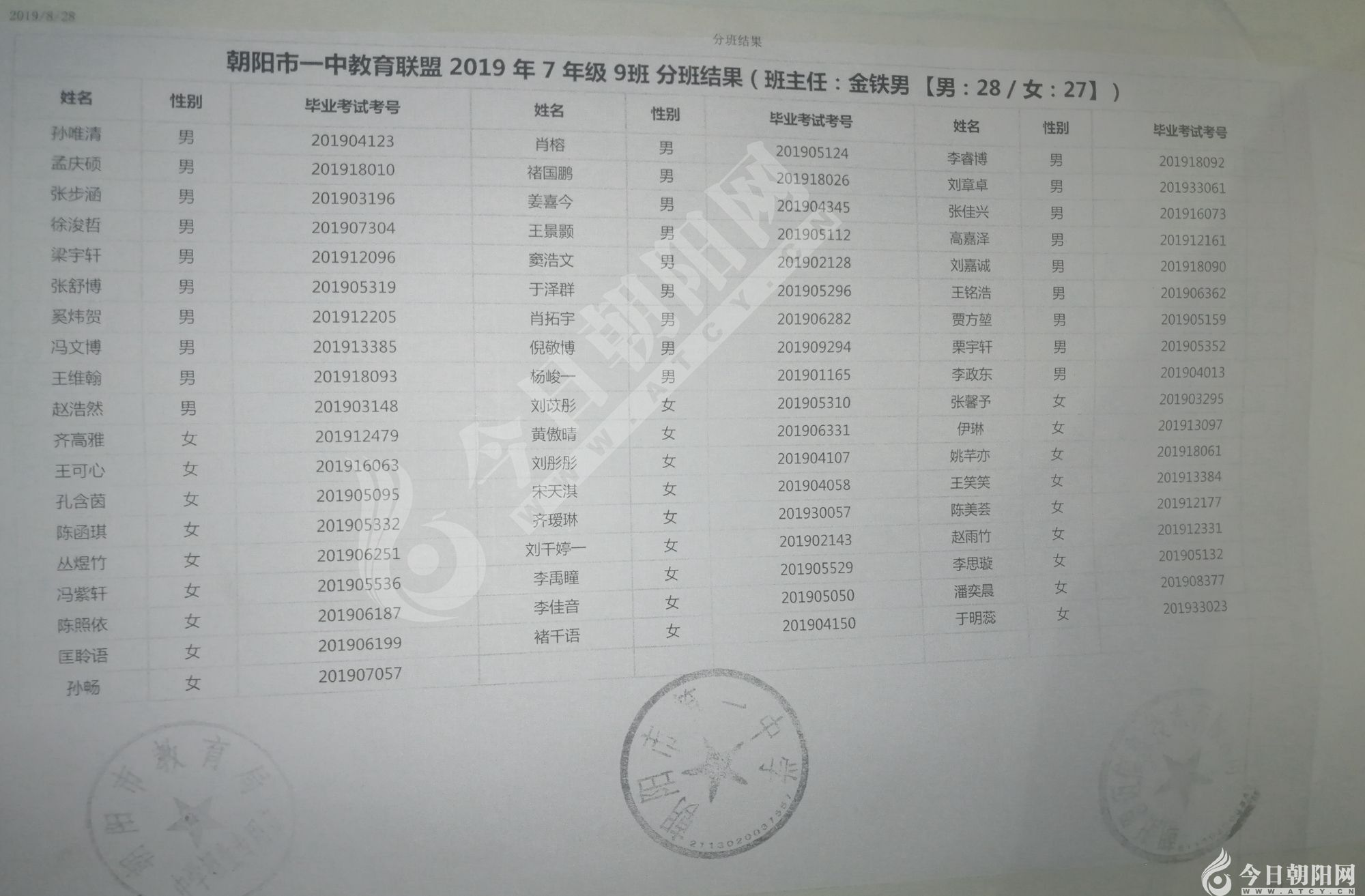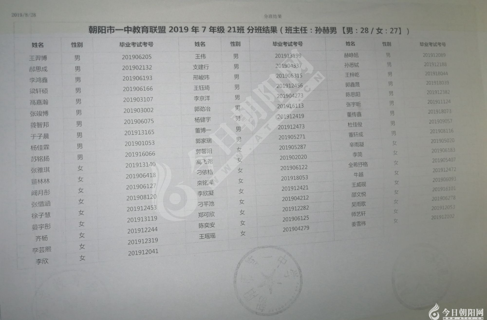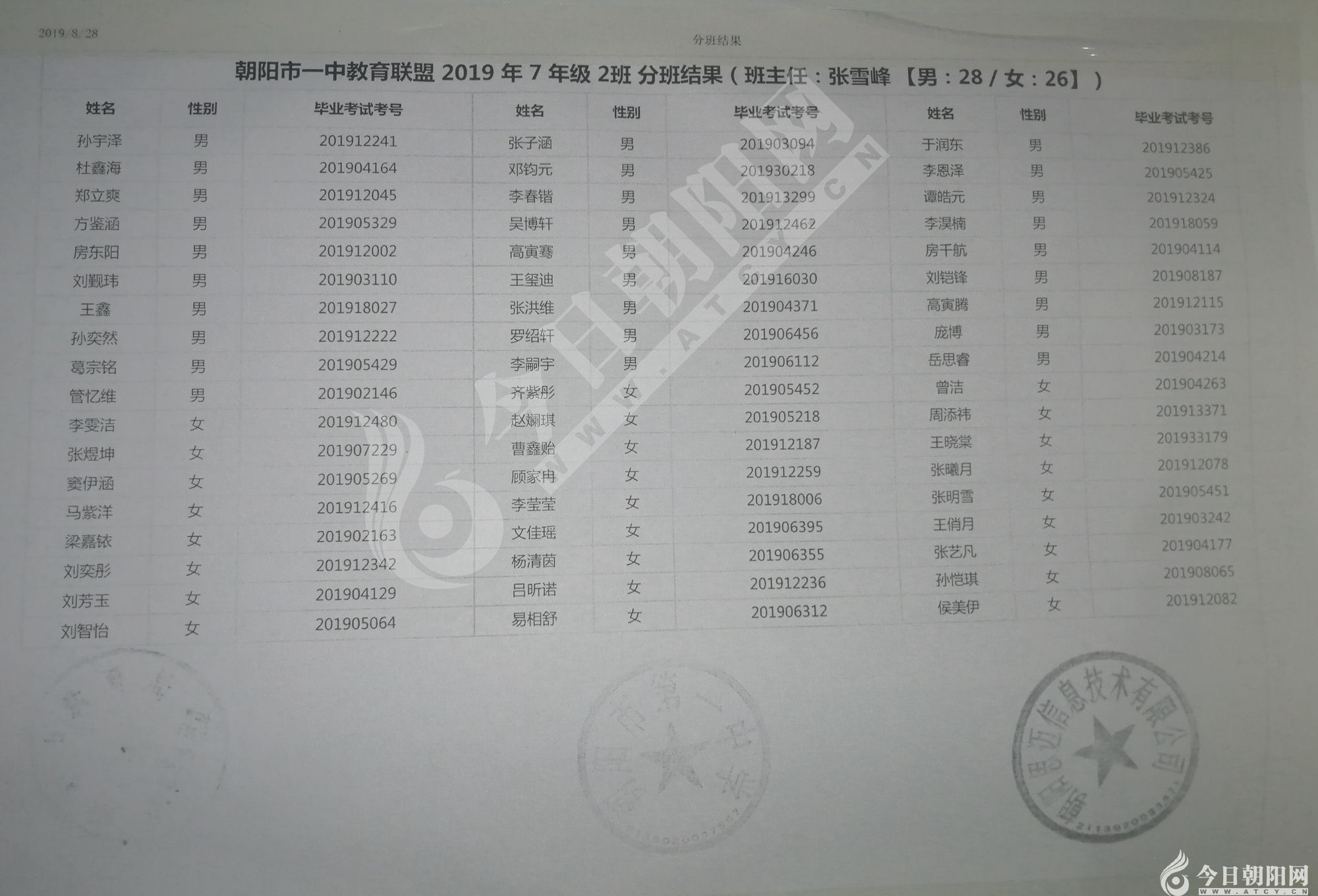 家長速看!朝陽市一中教育聯(lián)盟2019年新生分班表