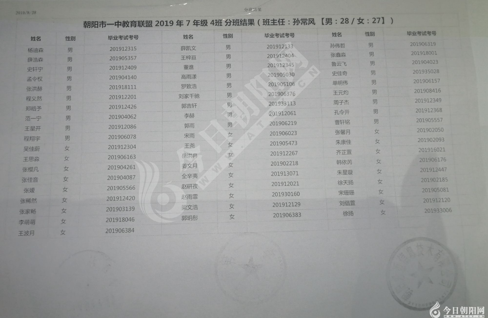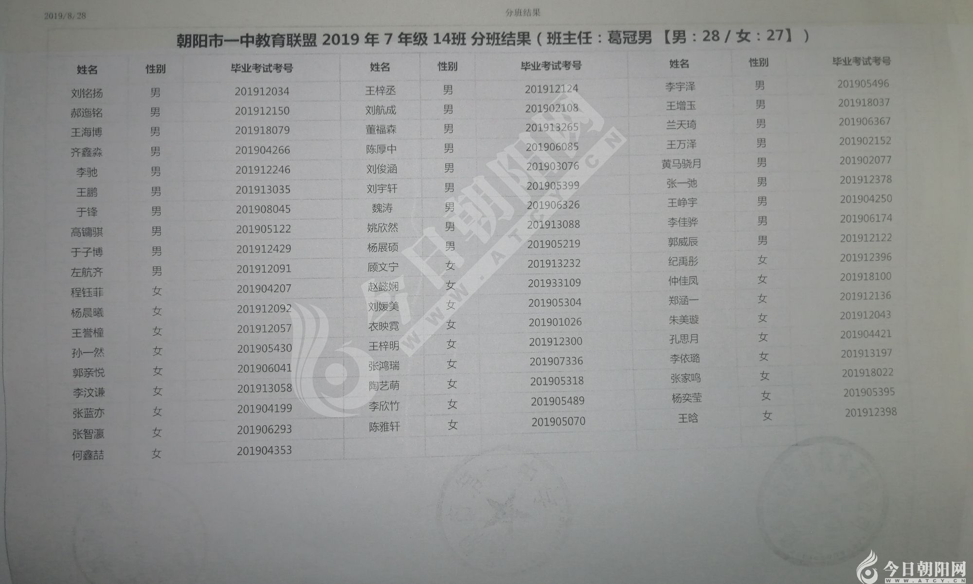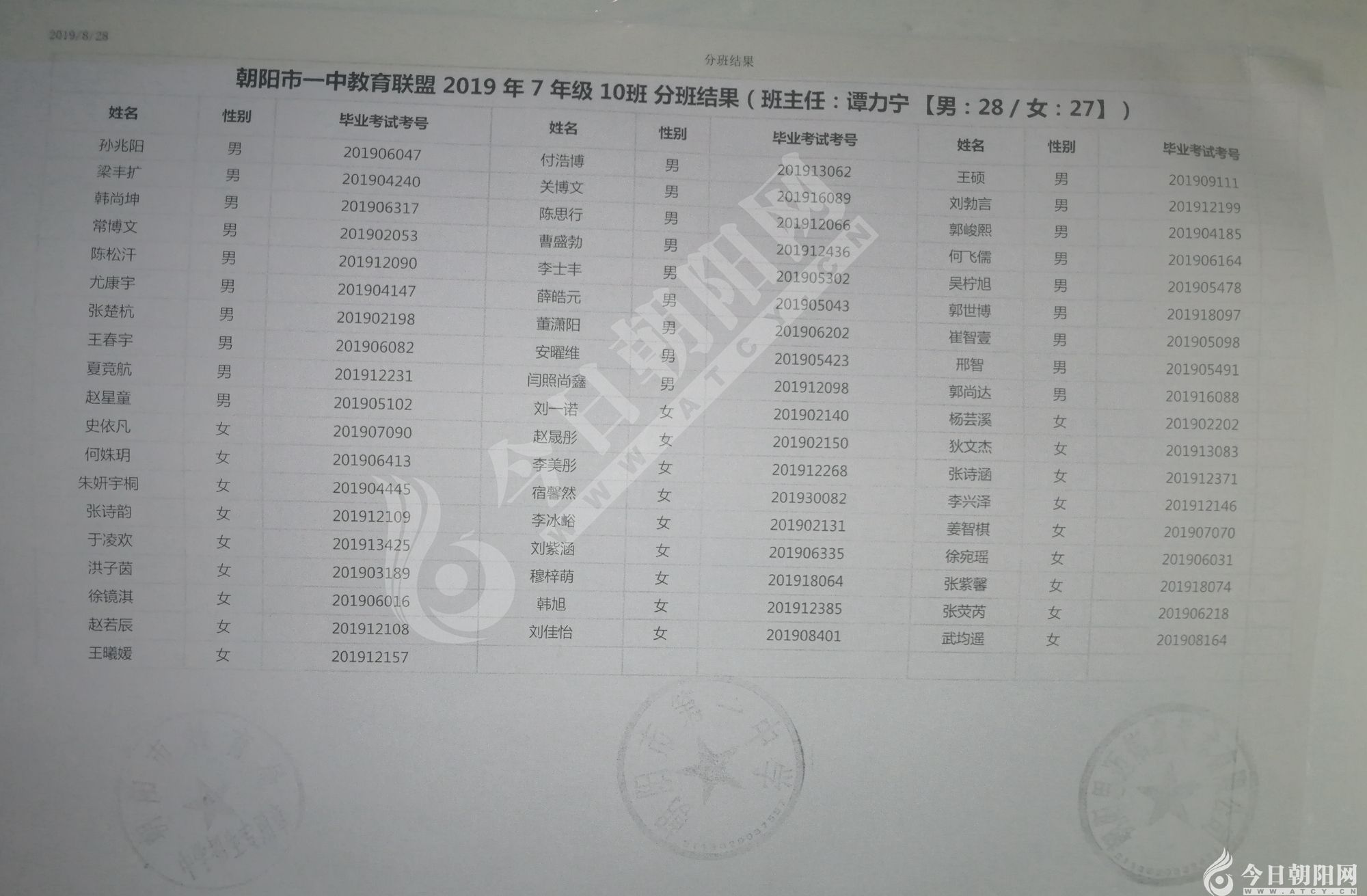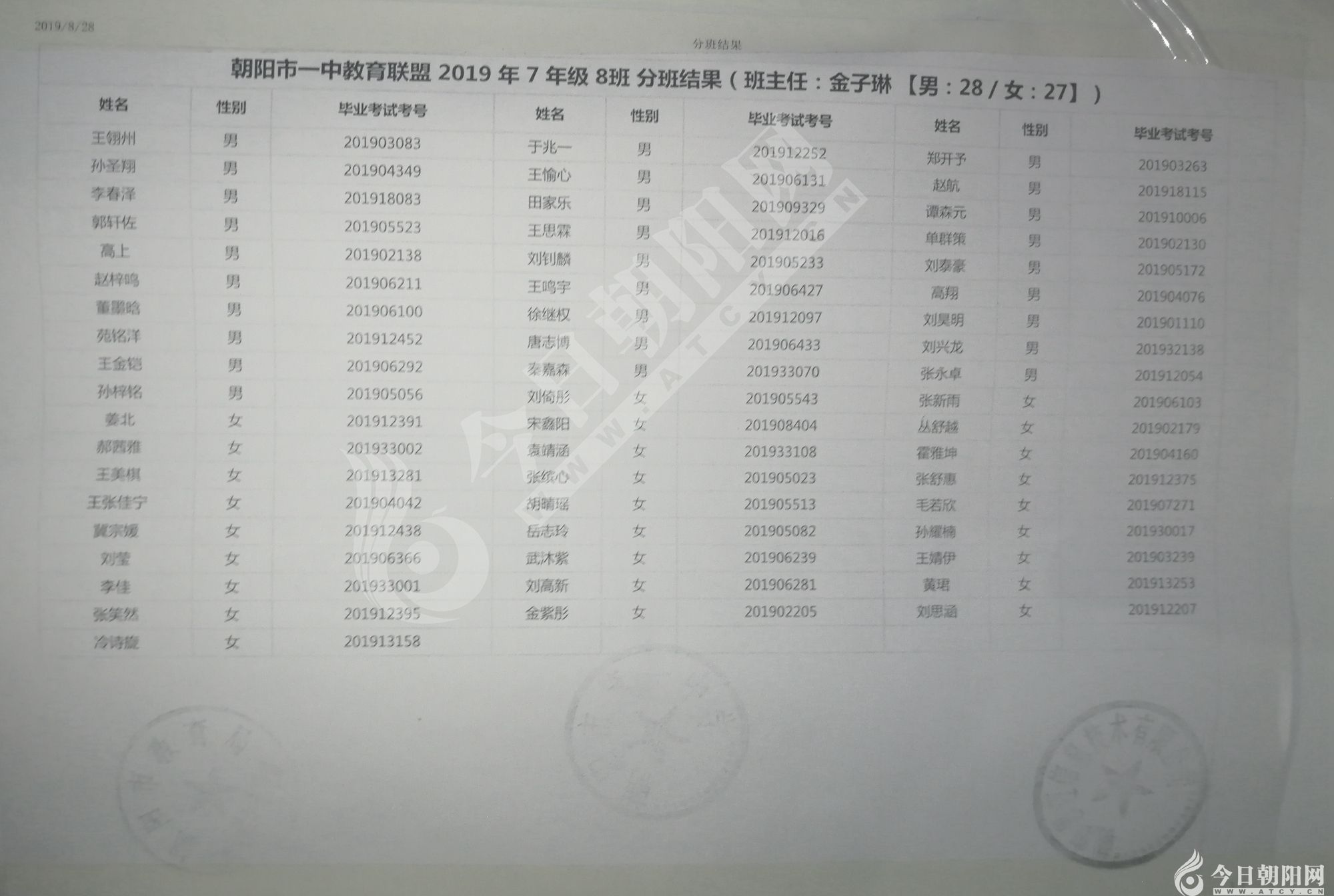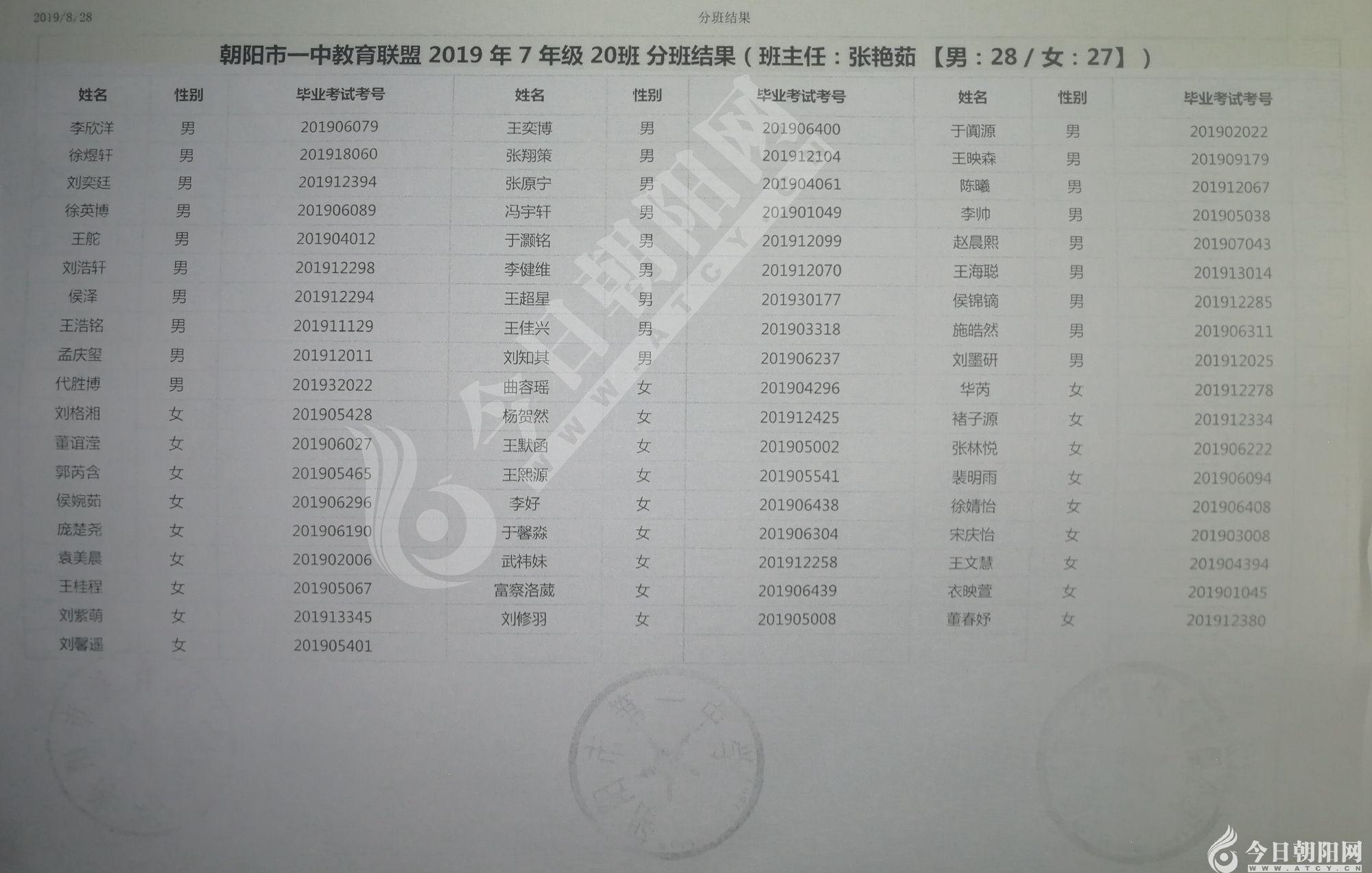 家長速看!朝陽市一中教育聯(lián)盟2019年新生分班表