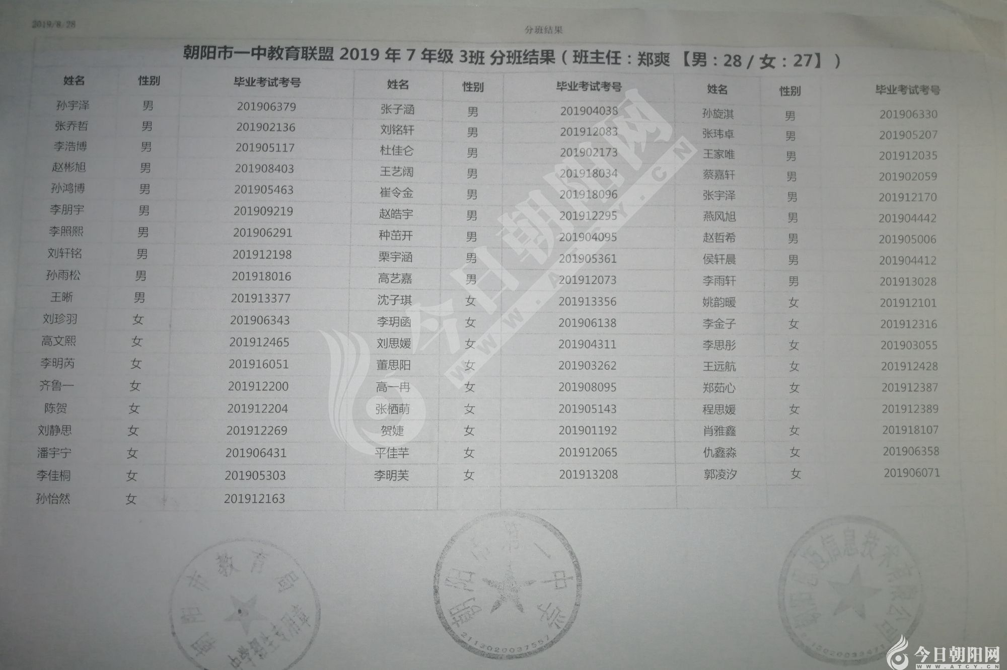 家長速看!朝陽市三中教育聯(lián)盟2019年新生分班表
