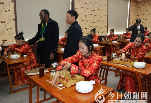 隨后,學生們?yōu)榭疾靾F一行進行了茶藝展示。一壺在手,品茗香茶,在清雅徐徐的茶香中,竟蘊藏著如此高深的茶文化。學生們溫婉、悠然的講茶布道深深吸引了每一位留學生,他們靜靜地坐在茶桌前,共享茶藝的溫馨和怡悅。