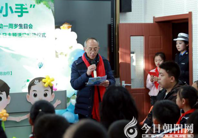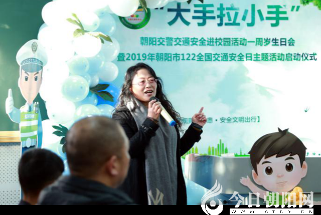 朝陽市紅綠燈志愿服務隊隊長顧凌嫣宣布交通安全進校園活動正式啟動。