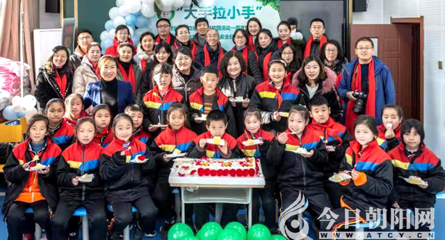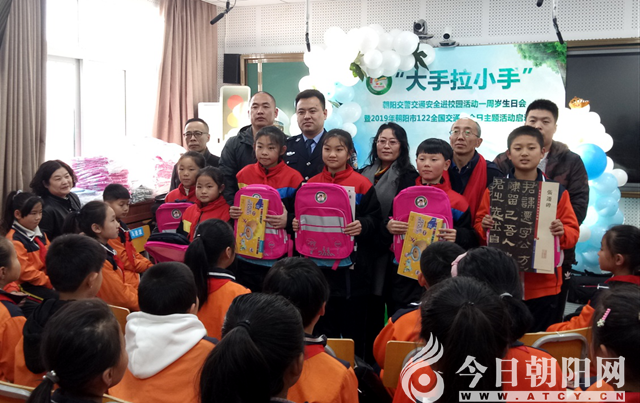 隨后,交警支隊的隊員為學生們發(fā)放了80個反光書包;朝陽教育志愿者、朝陽市城區(qū)中小學美術(shù)教師專業(yè)技能研訓班學員及市教師進修學院第三黨支部全體成員共同捐贈了價值4578元錢的美術(shù)、書法用品。孩子們同與會人員一起唱生日歌、吹蠟燭、切蛋糕,一起慶祝“大手拉小手”一周歲生日。