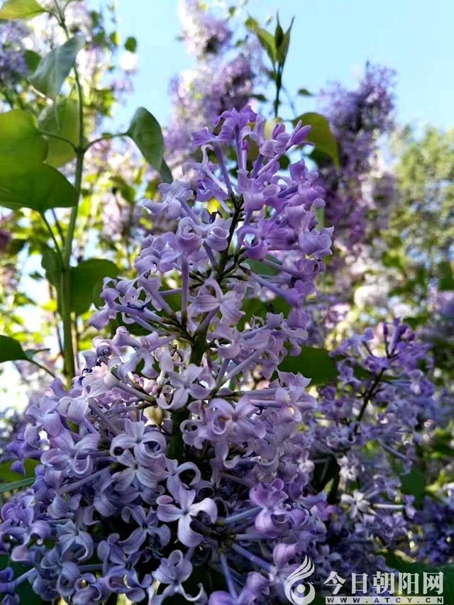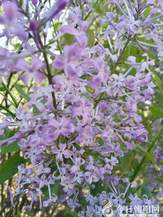 紫丁香層層疊疊的花穗是由一朵朵精致的小花組成的,每一朵小花有四個水滴形的花瓣,兩個一組,就像一對可愛的翅膀,茂盛的葉蒼翠欲滴。