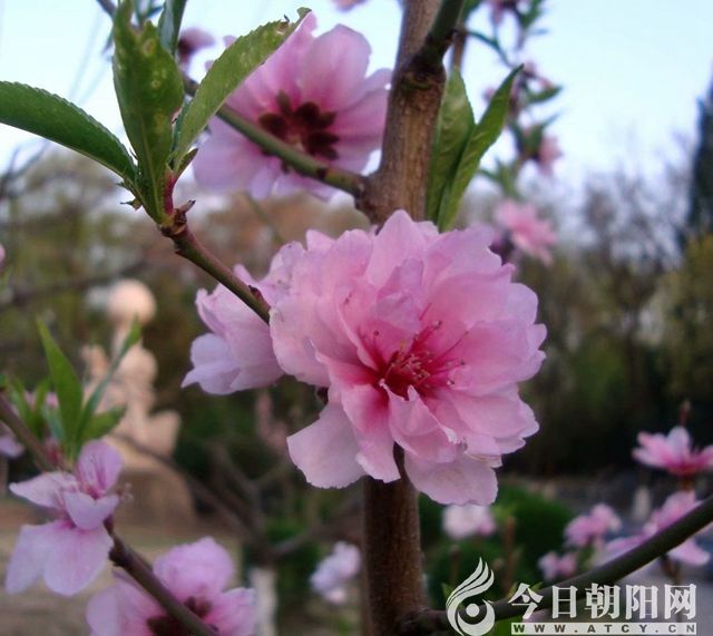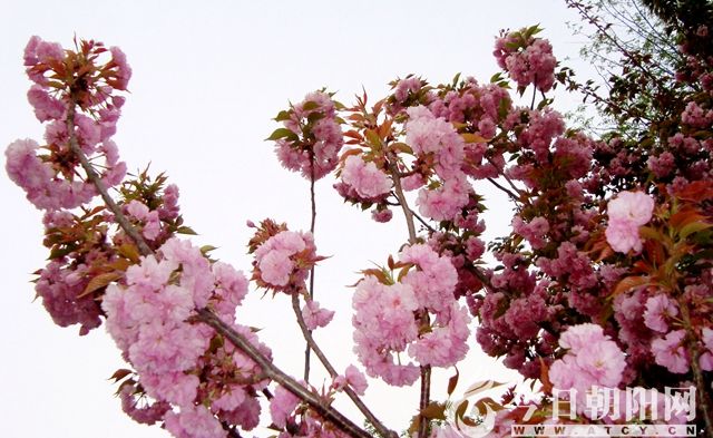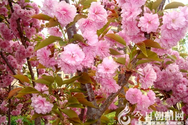 碧桃花、杏梅花、海棠花,同是薔薇科。朝陽栽植的很多。如果和櫻花比較,花朵大小無異。單觀賞花,分別不大。從顏色看,海棠花紅得熱烈。而碧桃、杏梅和粉色的櫻花幾無二致。葉子差別明顯。碧桃葉子像柳葉,杏梅、海棠葉子卵型革質(zhì)。櫻花葉子和榆樹葉基本一樣,邊緣的小鋸齒和榆樹葉沒有啥不同。所以我覺得,和櫻花媲美的喬木太多了。