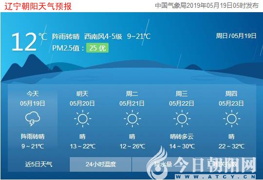 今天是2019年5月19日,星期日,農(nóng)歷四月十五。遼寧朝陽陣雨轉(zhuǎn)晴,氣溫9~21℃,西南風(fēng)4~5級,空氣質(zhì)量優(yōu)。日出時間:04:37;日落時間:19:13。