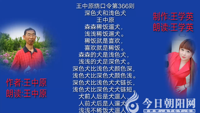 王中原,漢族,1947年生。函授中文??茖W(xué)歷,中學(xué)高級(jí)教師(已退休)。系今日朝陽網(wǎng)文化信使,中國楹聯(lián)學(xué)會(huì)會(huì)員,《咬文嚼字》雜志特約審校。曾為《語文學(xué)習(xí)》《演講與口才》等期刊業(yè)余審校數(shù)十年。近年撰寫繞口令300余則。個(gè)人原創(chuàng)繞口令專集《繞口令教你巧舌如簧》(趙立濤點(diǎn)評(píng)),被列入“新編播音員主持人訓(xùn)練手冊(cè)”叢書,由中國傳媒大學(xué)出版社出版發(fā)行。