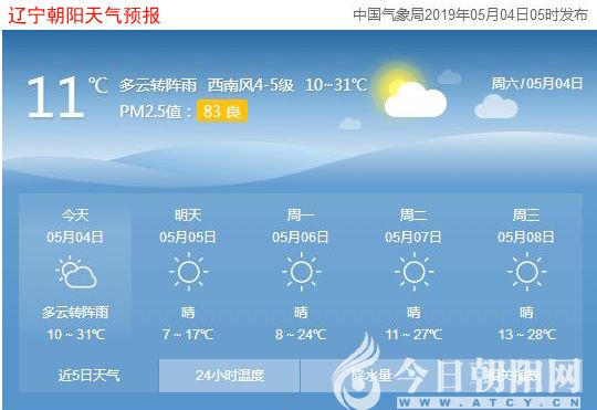 今天是2019年5月4日,星期六,農(nóng)歷三月三十。遼寧朝陽多云轉(zhuǎn)陣雨,氣溫10~31℃,西南風4~5級,空氣質(zhì)量良好。日出時間:04:54;日落時間:18:58。