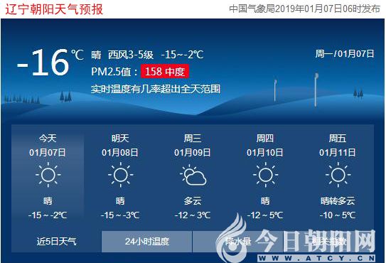 今天是2019年1月7日,星期一,農(nóng)歷臘月初二。遼寧朝陽晴,氣溫-15~-2℃,西風3~5級。日出時間:07:25;日落時間:16:43。