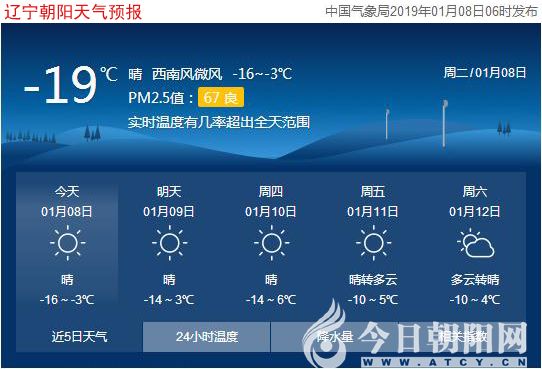 今天是2019年1月8日,星期二,農(nóng)歷臘月初三。遼寧朝陽晴,氣溫-16~-3℃,西北風(fēng)4~5級(jí),空氣質(zhì)量良好。日出時(shí)間:07:25;日落時(shí)間:16:44。