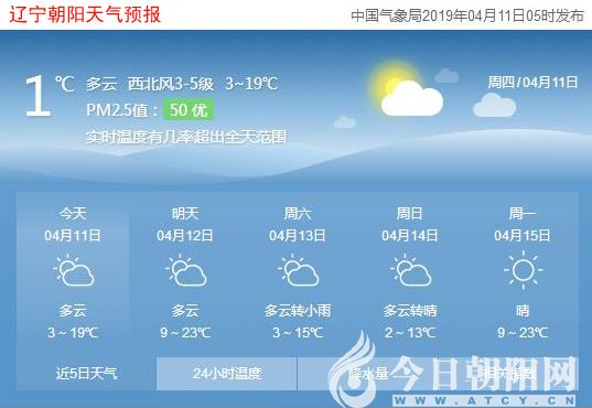 今天是2019年4月11日,星期四,農(nóng)歷三月初七。遼寧朝陽多云,氣溫3~19℃,西北風3~5級,空氣質(zhì)量優(yōu)。日出時間:05:28;日落時間:18:33。