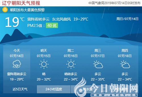 今天是2019年7月14日,星期日,農(nóng)歷六月十二,初伏第三天。遼寧朝陽雷陣雨轉多云,氣溫19~29℃,東北風微風,空氣質(zhì)量優(yōu)。日出時間:04:35;日落時間:19:32。(數(shù)據(jù)來源于中國氣象局2019年07月14日05時發(fā)布,請隨時關注天氣變化)