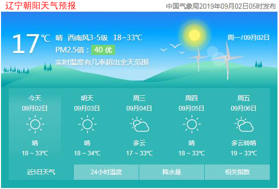 今天是2019年9月2日,星期一,農(nóng)歷八月初四。遼寧朝陽晴,氣溫18~33℃,西南風(fēng)3~5級,空氣質(zhì)量優(yōu)。日出時間:05:23;日落時間:18:32。(數(shù)據(jù)來源于中國氣象局2019年09月02日05時發(fā)布,請隨時關(guān)注天氣變化。)
